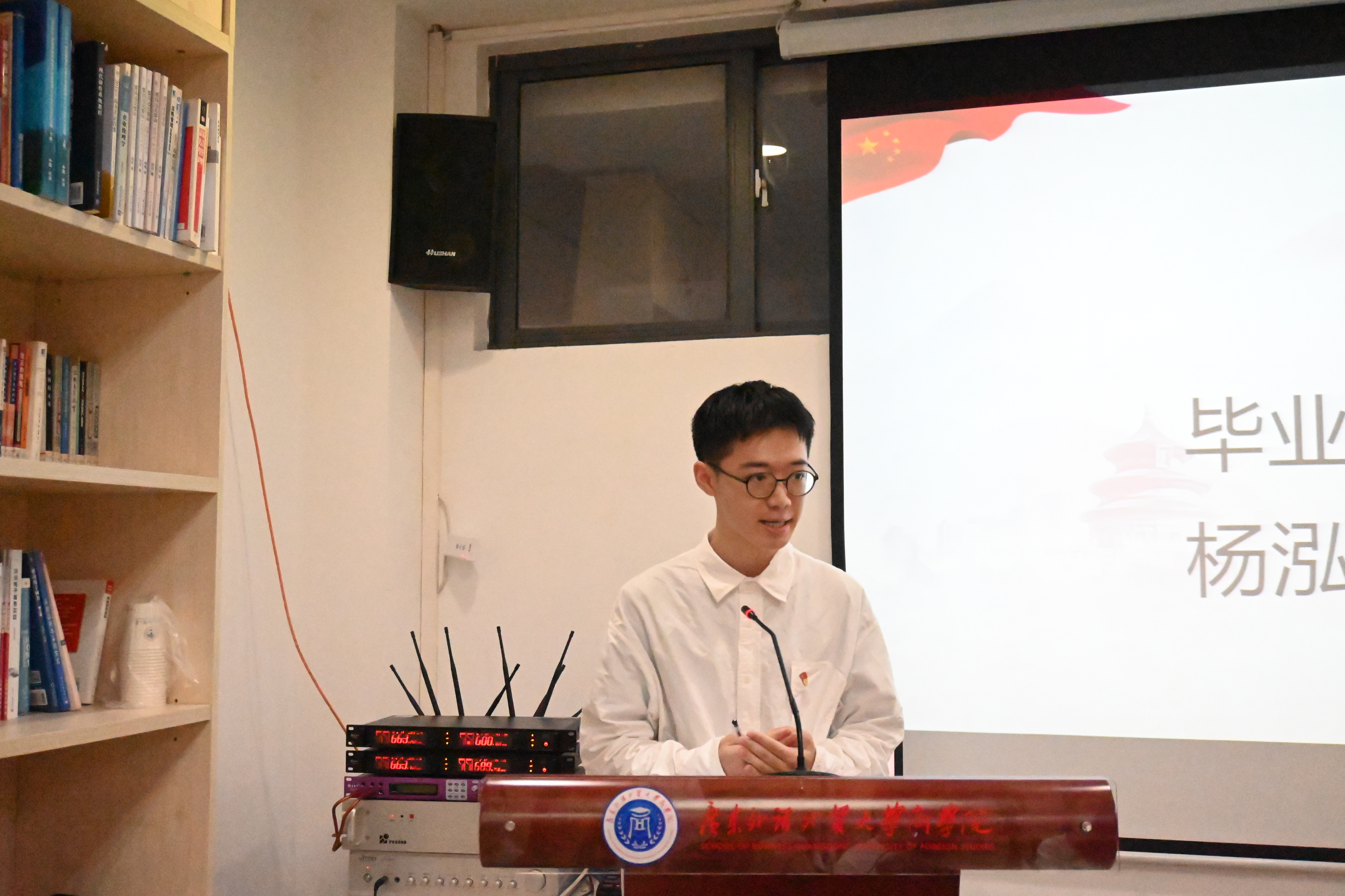 接着,毕业生党员代表杨泓楷发言,他回顾了自己精彩的大学经历,勉励同学们要以青春梦想,用实际行动为实现中国梦做出新的贡献,更要牢记党员身份,练就过硬本领,将小我融入祖国和时代的大我当中。最后,他代表全体毕业生党员们祝愿母校事业蒸蒸日上、再创辉煌!