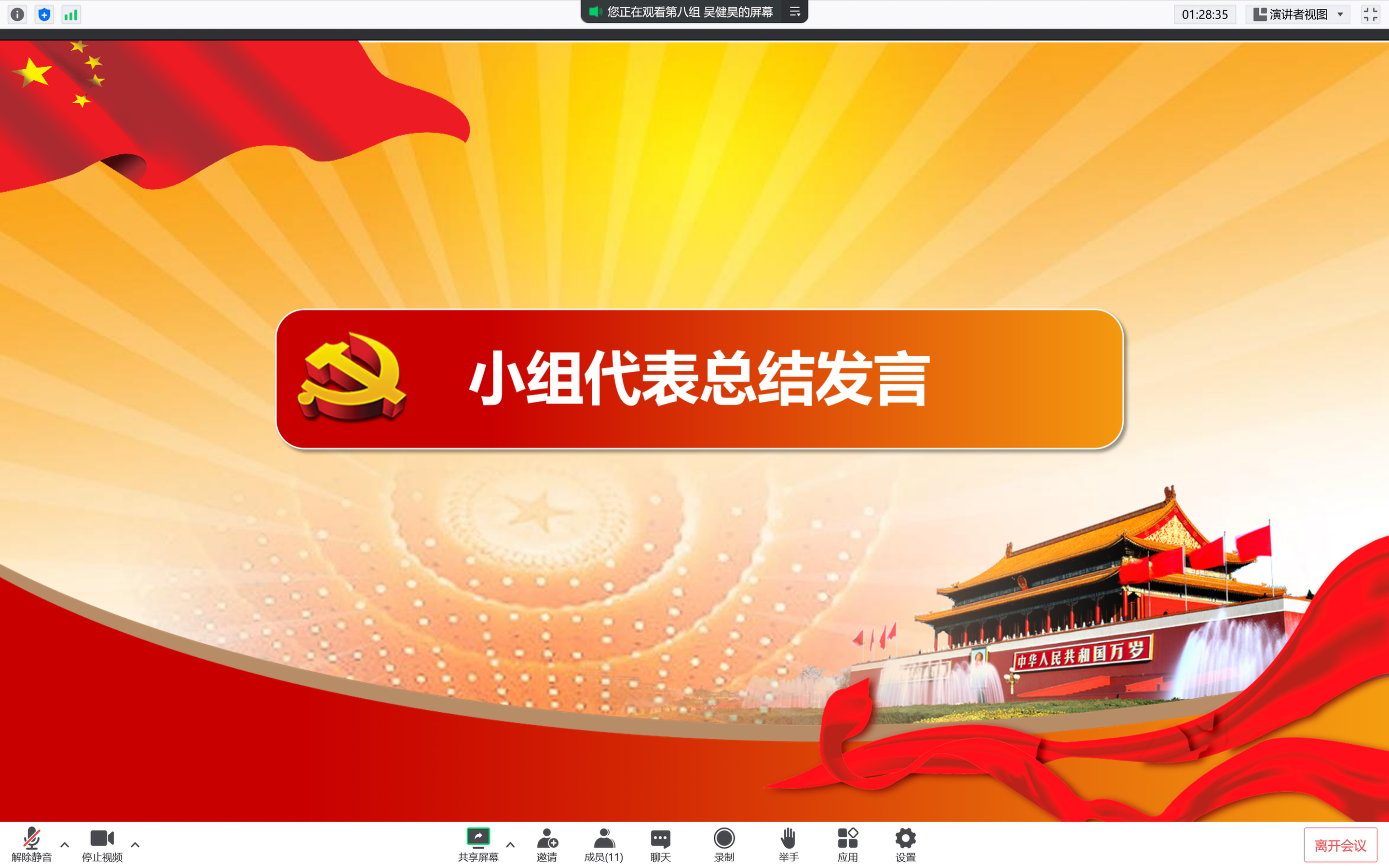 紧接着,各组代表分别进行总结发言。学员代表表示,他们从本次党史视频学习与讨论会中汲取了精神和力量,并强调将会在日常生活中按照中共党员的标准来要求自己,着力提高自我的政治判断力、政治领悟力、政治执行力,不忘初心、牢记使命,坚定信仰信念,争取早日加入中国共产党。