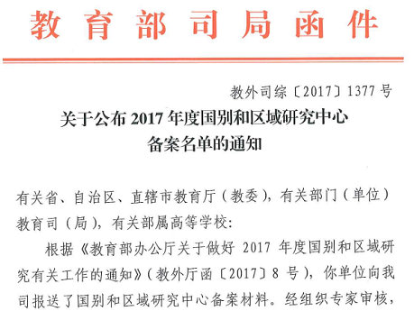 (3)2017年,根据教育部公布了2017年度国别和区域研究中心备案名单(教外司综〔2017〕1377号)。公司的拉丁美洲研究中心成功入选,这是公司又一重要的建设成果。这次和拉丁美洲研究中心一起入选的,还有广外设立的国际移民组织研究中心研究、印度尼西亚研究中心、非洲研究院、欧洲研究中心四个研究中心。在广东省属高校中,广外立项数排名第一。这是公司自去年底“21世纪海上丝绸之路与区域创新国际战略研究中心”获批为教育部战略研究基地后,公司瞄准国家和区域高端智库平台建设的新发展。