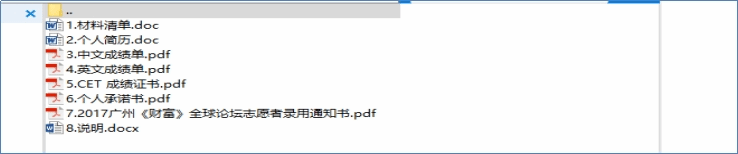 要求:第一,压缩文件包以学号+姓名命名;第二,压缩文件包里面文件必须排序,有序号;第三,压缩文件包中须有材料清单,材料清单列清楚压缩文件包里面其他文件及序号。以下为例子,同学们可根据具体情况提交。