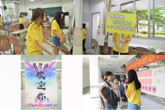 清晨七点整,商院团学的“小黄人”便早早地前往新生报到地点教学楼G栋集合,开始准备迎新工作。注册点的布置、流程图的设计、迎新路标的指引,每一个环节都饱含着对新生到来的热烈欢迎。