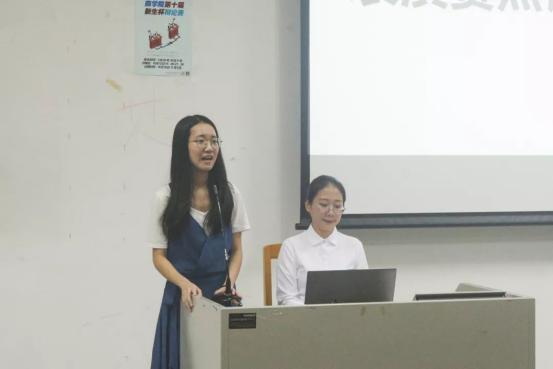 在培训环节中,商院辩论队代表吴菲菲为即将参加辩论的选手们介绍了辩论赛新赛制和辩论礼仪,并分享了辩论资料来源,详细讲解了辩论的实用技巧以及一辩稿的组成。