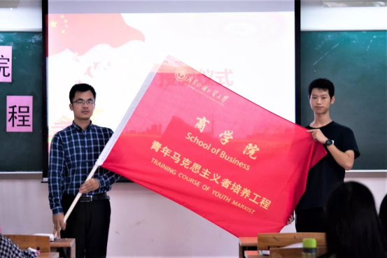 刘郎老师为第三期“青马班”新学员代表授旗,学员代表激情地挥动着红色的旗帜,现场气氛高涨,学员们热烈鼓掌,随后刘郎老师与学员代表合影留念。