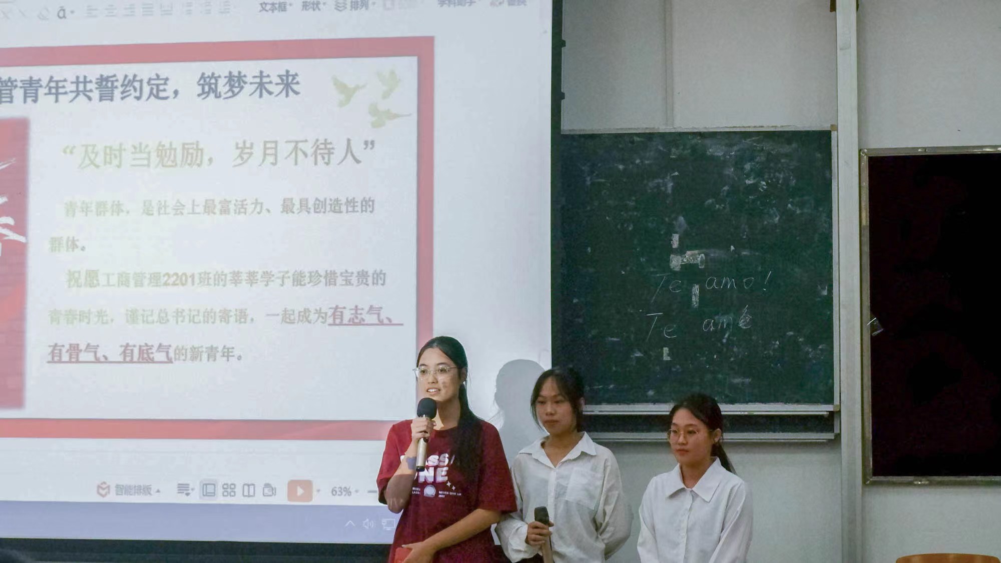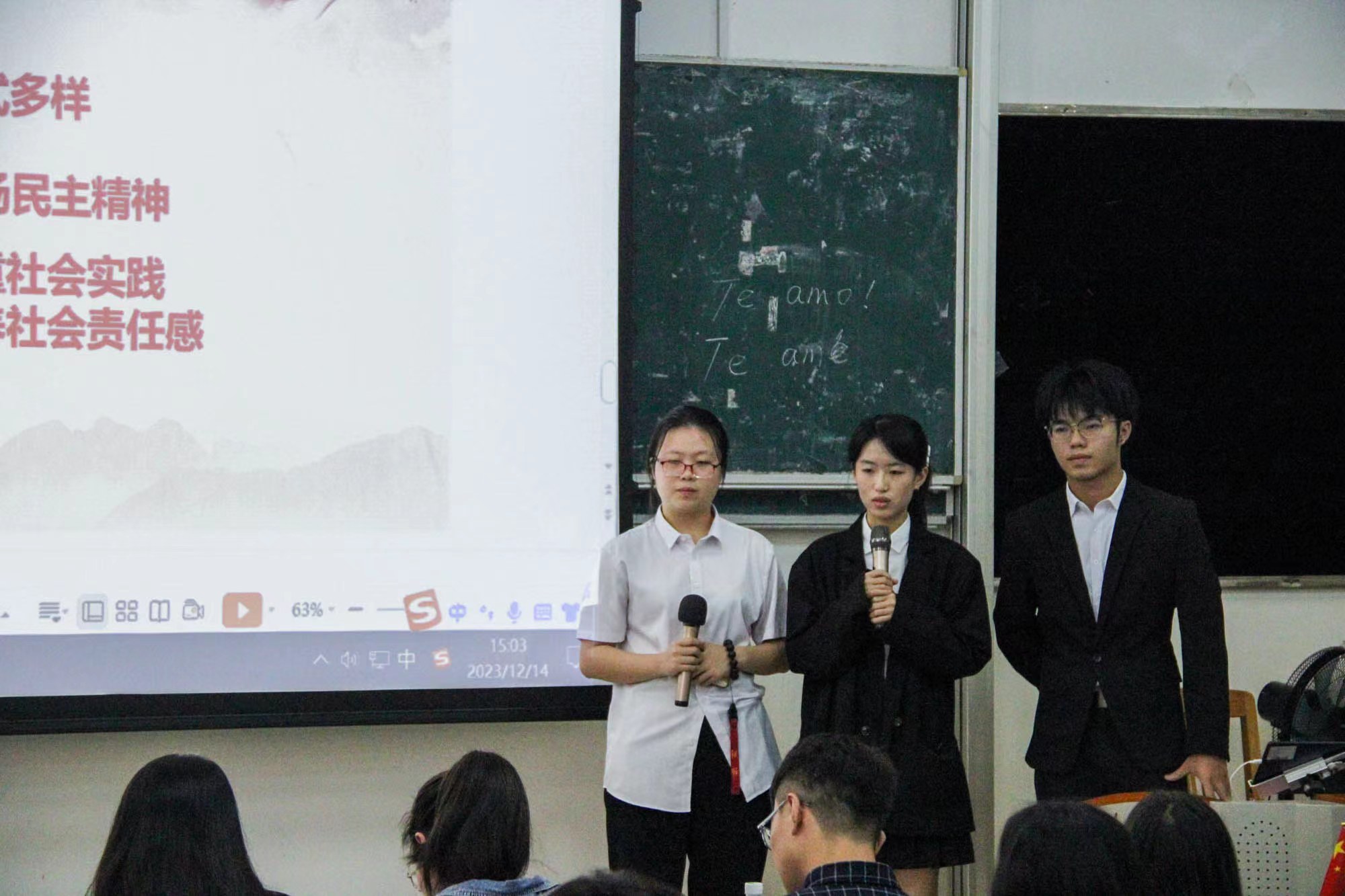2023年12月14日下午,2023-2024学年第一学期主题团日活动展示报告会于大学城校区教学楼F215顺利举行。校团委专职团干李新璐,365英国上市公司团委书记张哲、2023级辅导员秦雨,365英国上市公司团委副书记黄冰、员工会执行主席刘笑君,展示团支部代表和各年级员工参加会议。