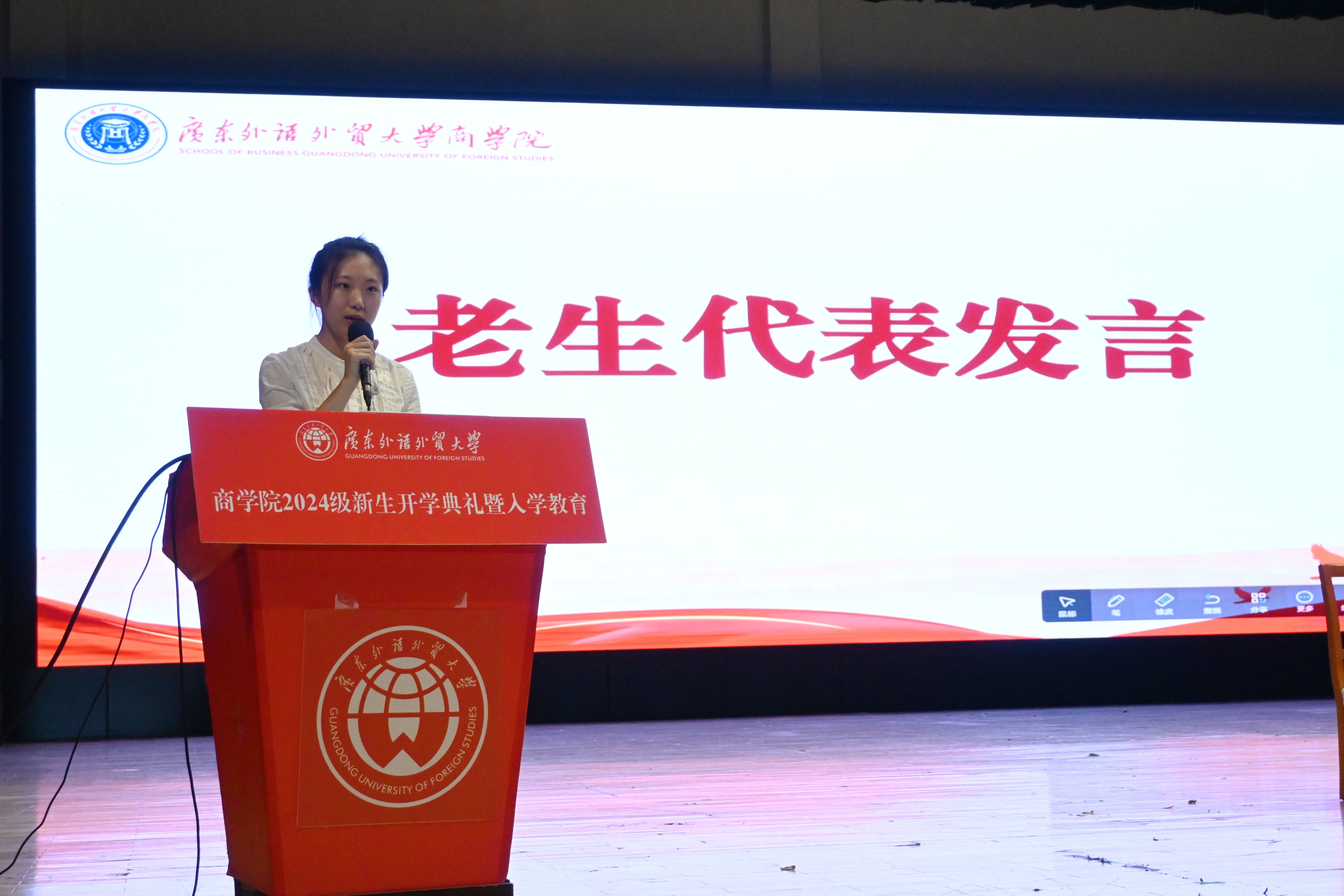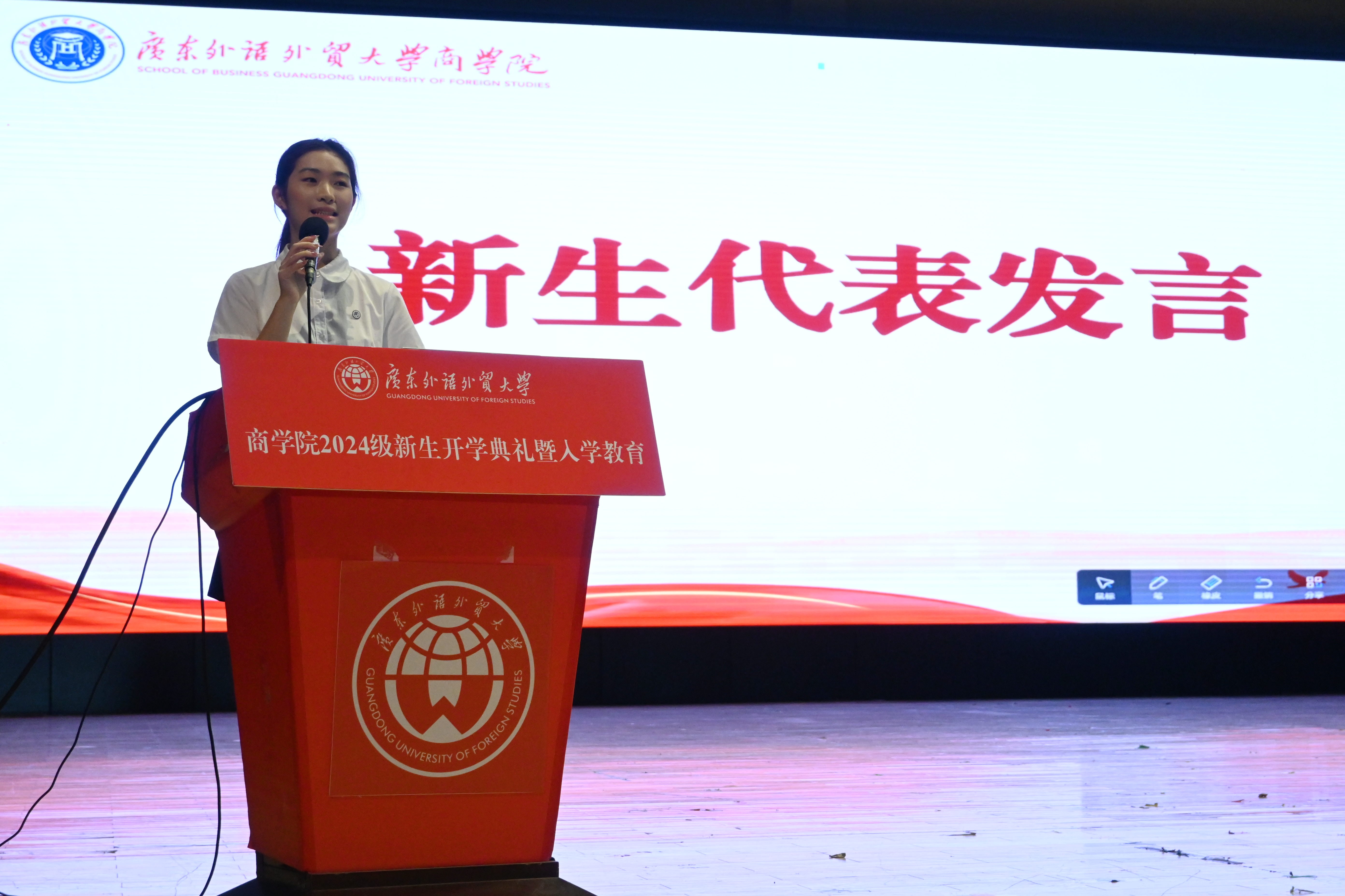 来自2024级供应链管理专业的新生代表吴雨霏在典礼上发言。她表达了对在广外学习生活的无限期待,同时提出,作为广外学子,应铭记“明德尚行,学贯中西”的校训,怀揣梦想,坚定使命,将青春梦融入中国梦,将专业知识付诸实践,用青年人铿锵有力的步伐向新时代交出一份合格的答卷。
