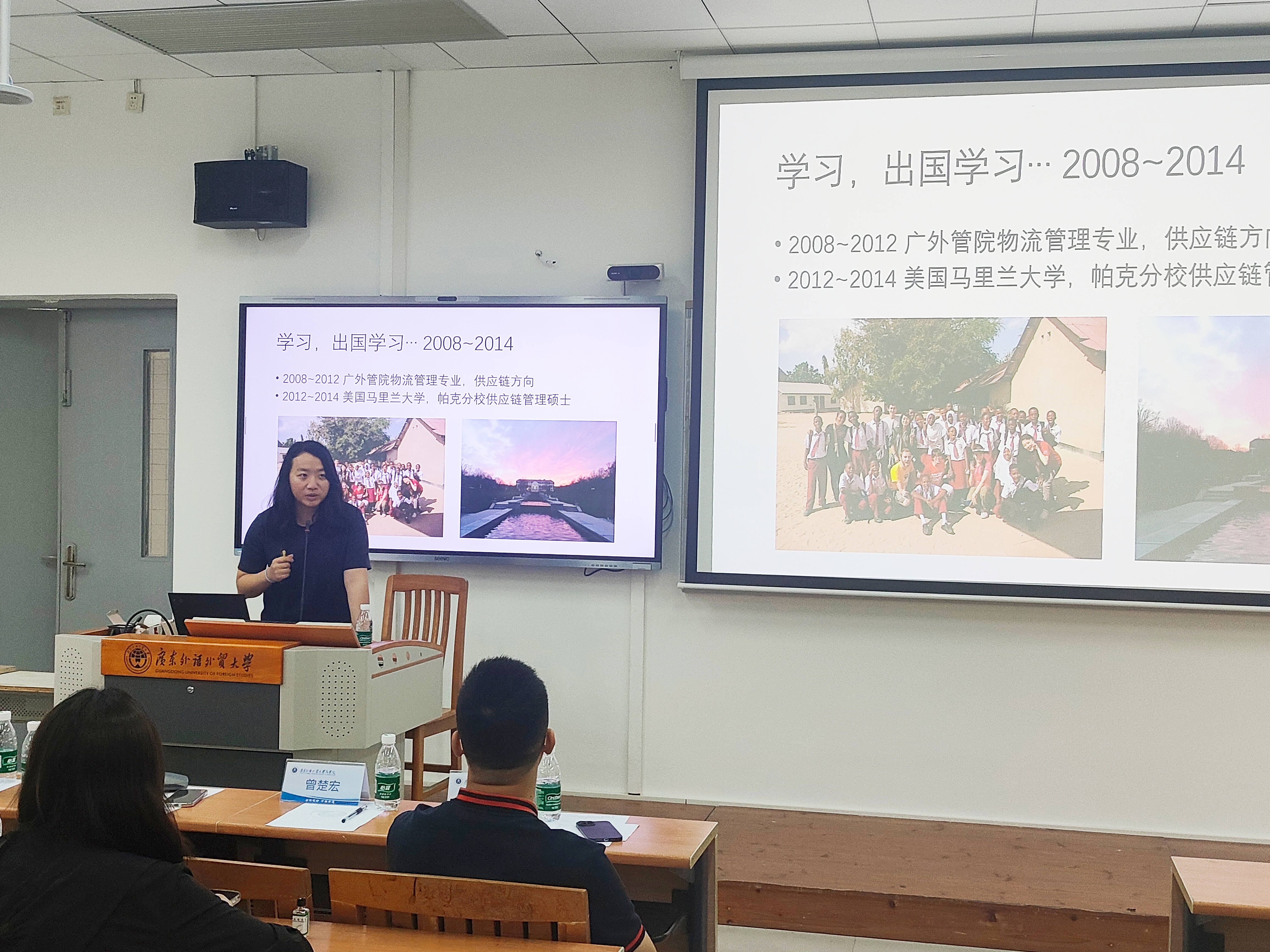 接着,马颖员工为新生进行个人经历的分享。她从个人学习、工作、生活经历等三个方面进行介绍,并强调了阅读的重要性,鼓励新生充分运用图书馆资源,同时呼吁同学们发挥广外学子特有的外语优势,培养学贯中西的思维模式,抓住宝贵的学习机会,去探索更多元的世界,从而“增加生命的厚度”。