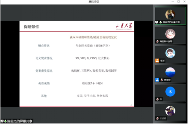 在经验分享环节,成功推免至山东大学的陈俊杰同学结合自己的保研经历分享了自己的心得;考研至四川大学的程思迪同学从动机与择校、作息与时间规划、树立正确的考研观等方面分享了自己的备考经验。分享结束后,参会同学积极踊跃提问,面对大家的提问,两位同学积极回应,耐心解答了大家有关专业课复习和学术经历准备等方面的困惑。