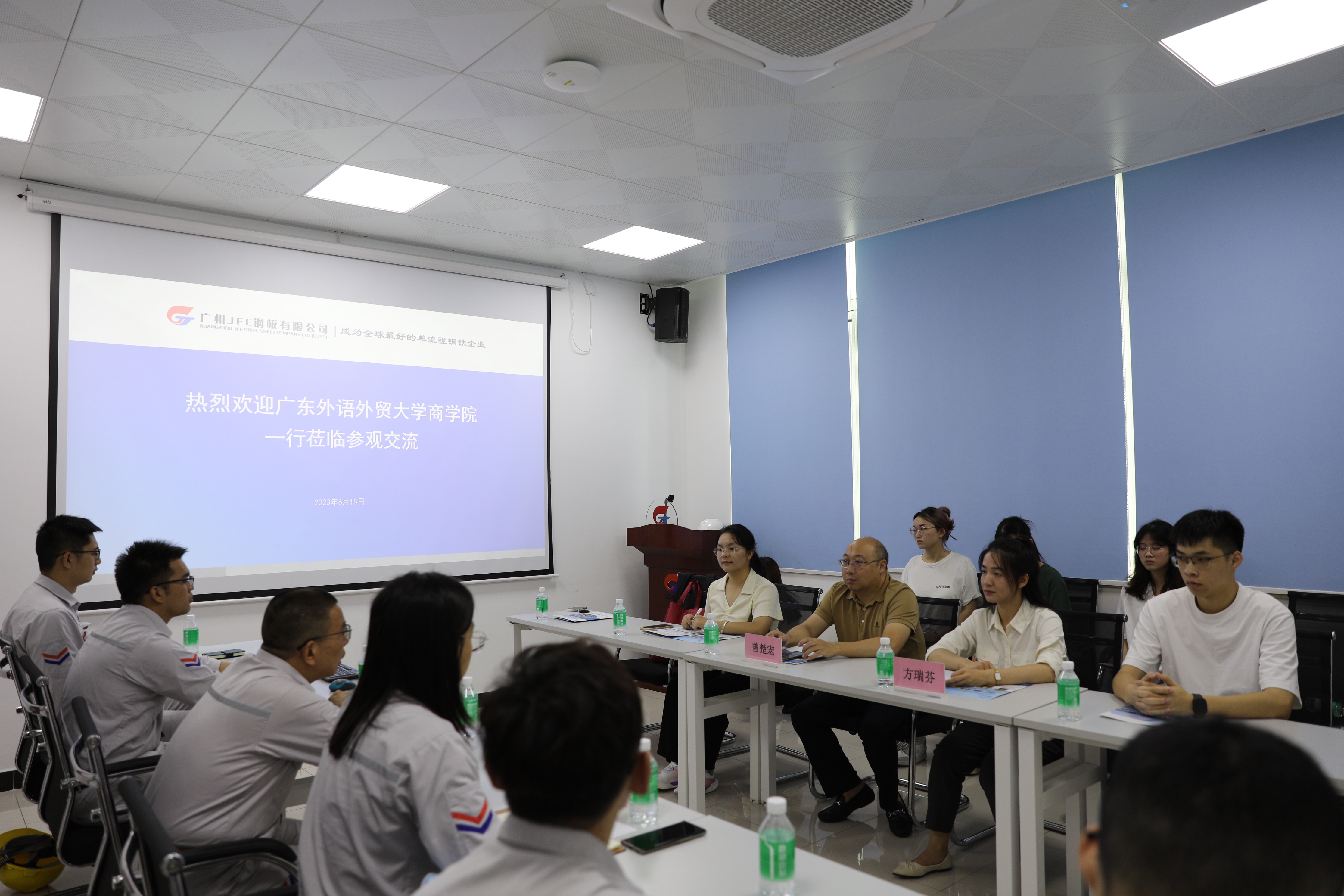 广州JEF钢板有限公司党委书记黄远春对公司师生的到来表示热烈欢迎,详细介绍了广州JFE钢板有限公司的建立、发展、壮大的一系列过程,阐述了其产品的种类、生产加工过程。随后,曾楚宏经理介绍了公司情况,也对双方未来的合作交流进行了探讨。
