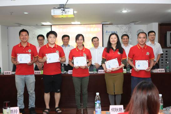各位领导和嘉宾为2015年度初创班学员颁发由广东省人力资源和社会保障厅印制的《广东省初创企业经营者素质提升研修班结业证书》。