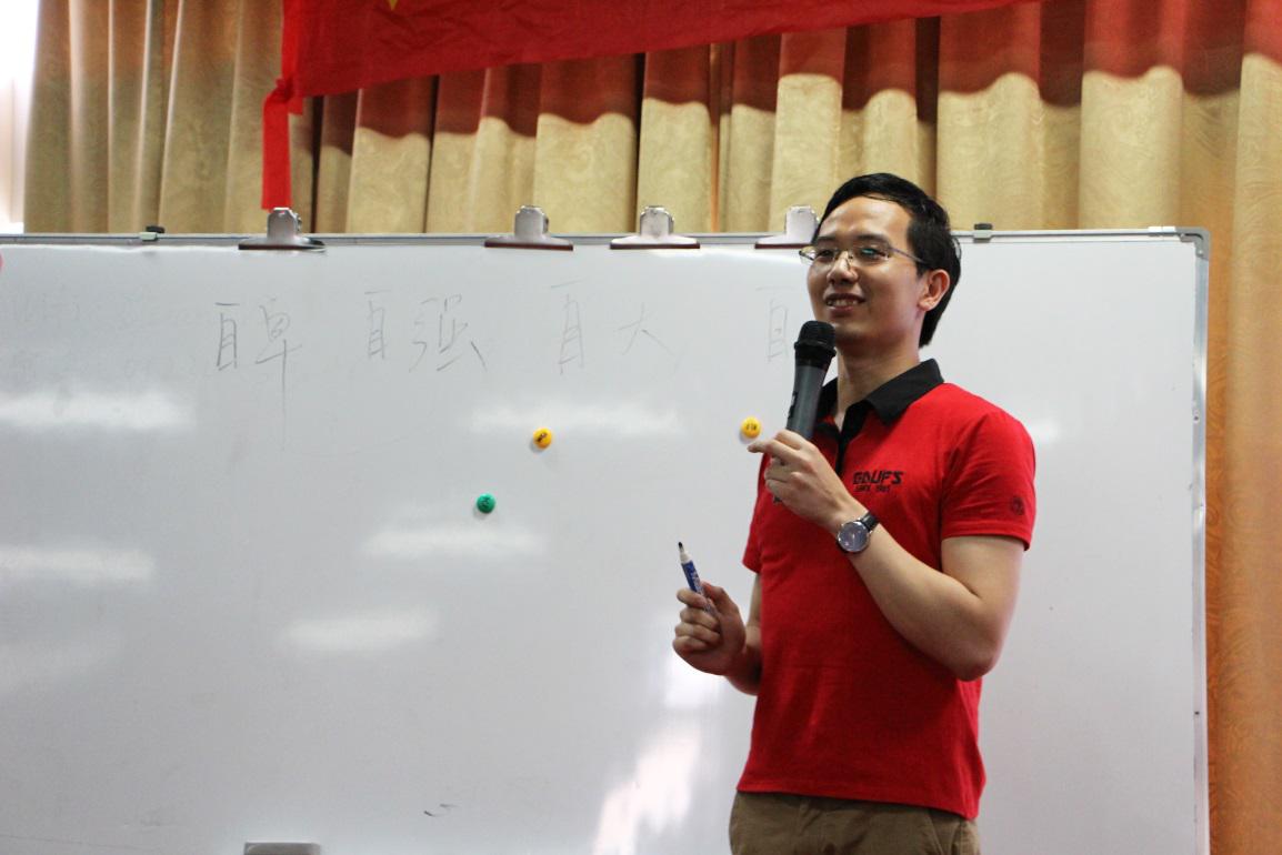 黄崇本把自己的大学四年概括为“自卑、自强、自大、自谦”。他表示,作为一个来自粤西农村的贫困生,刚进广外的第一年由于自卑而默默无闻,对什么都羞于表达自己。后来渐渐地尝试融入到大群体之中,通过自己一步一步的努力,转变成一个自强的人,并在大二时担任班级团支书、广袤园武协主席等职位。或许正是被大二的成就冲昏了头脑,大三时他成了一个自大自满的人。然而,大四时,看到周围同学比自己有更好的发展机会,而自己却因为能力不够而略逊于他人时,他顿悟做人该自谦,于是不断向他人甚至师弟师妹学习。黄崇本用他大学四年的心路历程,告诫在场同学即使我们有时会因各种各样的理由陷入迷茫和自我认知的偏差,但只要你有改变自己的想法并不断进取,最终都会成功。除此之外,他还分享了自己工作时的一些遭遇和升职经历,并且通过一个情景假设提点在场同学如何正确地处理突发情况。