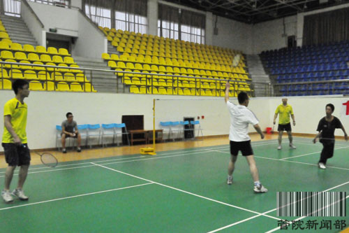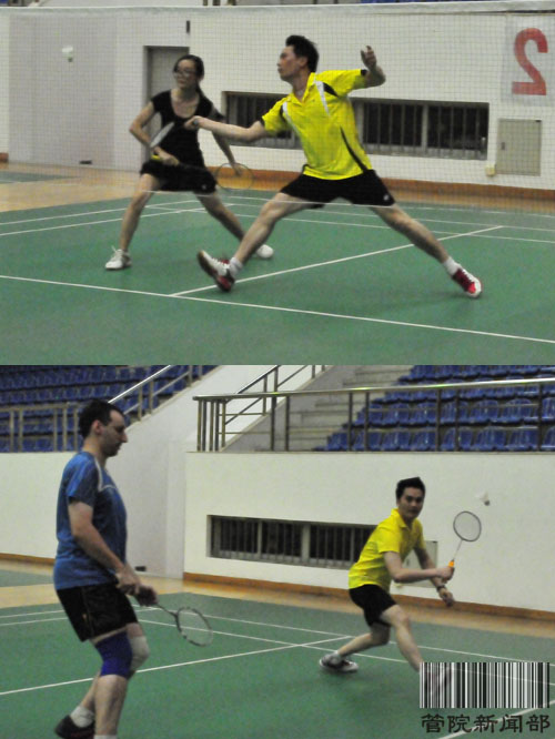 在男女混双中,员工羽协会会长林明师兄用幽默诙谐的语调、兴奋的呐喊,带动现场气氛、激发球员的斗志,并身兼多职:队员、教练、裁判,进行现场教学,指导院队队员,忙得不亦乐乎。作为本次比赛唯一的男双队伍,周行和院队队员的组合堪称完美,经验与活力并存,赢得全场连连掌声。