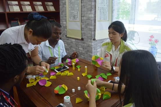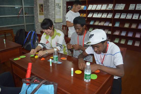 8月21日下午,义工把学员分为3组进行竞赛游戏。内容包括了汉字拼音、英语词组乱序重组以及抢凳子等游戏。外教和营员互相合作努力,努力为自己的队伍夺取第一。