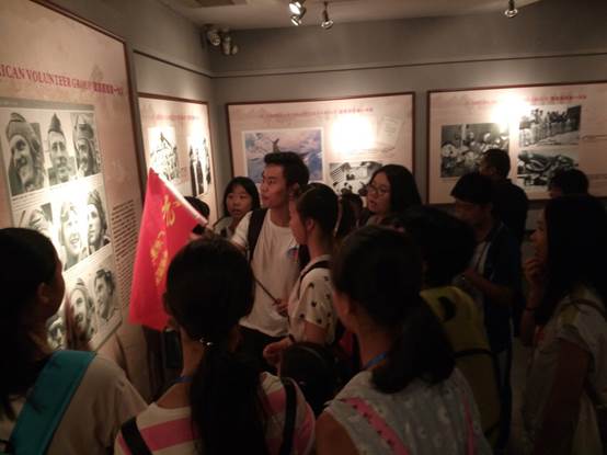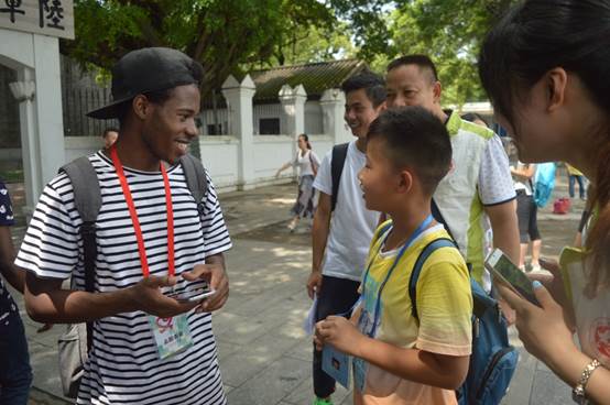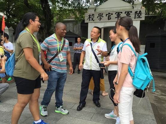 8月19日上午,义工带营员来到黄埔军校进行参观学习。营员与外教见面后,就主动用英语和外教打招呼,并相互了解对方的名字和爱好。