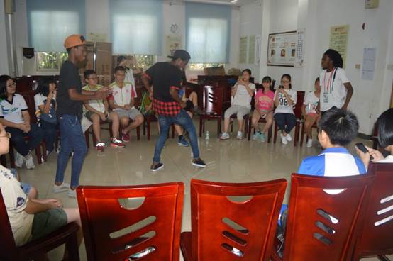 8月20日,营员来到大沙街道办事处的课室在外教的指导下学习英语歌曲和外国民族舞蹈。