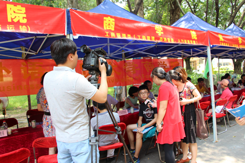 当日,“小黄人”们一大早就起床,在辅导员的带领下伴着清晨明媚的阳光来到北校,到达地点后便毫不耽搁地开始布置场地——摆放名牌、悬挂横幅、摆放桌椅、布置展板、派发早餐……如夏日般热烈的是他们饱满的热情,如阳光般灿烂的是他们亲切的笑容。活动开始,家长与员工们陆续前来,从公司大门到商院的摊位无一不活跃着“小黄人”们卖力的身影。派发传单、介绍宣传、礼仪接待、公众号推广,热情洋溢的“小黄人”们不断吸引着家长与员工们来到公司的摊位处。公司领导与教授也耐心细致地为前来咨询的家长与高考生们进行专业的讲解,展现出365英国上市公司友好待客的精神风貌。气温高,但师生们的热情更高,现场气氛如火如荼,大家配合默契,取得了非常好的效果。更有电视台的记者们被商院摊位所吸引,前来拍摄和采访。