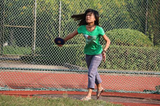 圆形的投掷圈,白线描出的扇形区域,后方的绿色隔网,这三样让人倍感专业的铁饼设备吸引了众多视线,参加女子铁饼项目的选手们更是在下午2点整便早早地来到检录处,迫不及待地在比赛场地进行试掷。“嗬!”随着一声声短促的呼喊,女子选手们柔和缺不失力度的身躯如舞者一般旋转起来,手中的铁饼应声掷出,在空中划过一道优美的抛物线后落地。