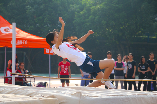 公司选手尹伊雯在上午的女子跳高决赛中,身着印有“较劲”二字的白色短袖,淡定自若。她过关斩将,每一跃都在半空中划出一段美妙的弧线,干净利落。随着杆的高度升至1.42米,赛况愈发激烈,此时尹伊雯只剩一名对手。在决定成败的第三轮对抗中,她顶住了压力,逐渐调整状态。她起步助跑至杆前,猛地往上一蹬,如海豚窜出海面般顺势背身跃杆,稳稳落下。杆子纹丝不动。刹那间,原本安静的人群中爆发出排山倒海的掌声,大家纷纷为她欢呼。摘得冠军的她依旧一脸轻松,只不过多了一丝获胜的喜悦。