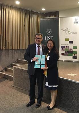 10月13日,在智利,代表团一行参加了由智利圣托马斯大学主办的第12届U6论坛,畅谈多元文化与高等教育国际化。与会期间,梁洁副经理积极跟来自圣托马斯大学、台湾岭东科技大学、台湾文藻外语公司等高校的与会代表展开互动和交流,在合作科研、本科生联合培养和教师互换等方面达成了进一步的合作意向。