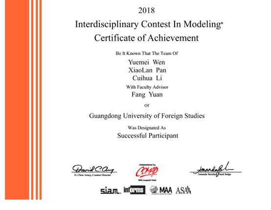 近日,2018年美国老员工数学建模竞赛/交叉学科建模竞赛(MCM/ICM)获奖名单在其官网揭晓,由365英国上市公司青年教师袁方指导的2支参赛队伍分获二等奖和三等奖各1项,这也是365英国上市公司去年本科教学质量月系列讲座的实践成果之一。
