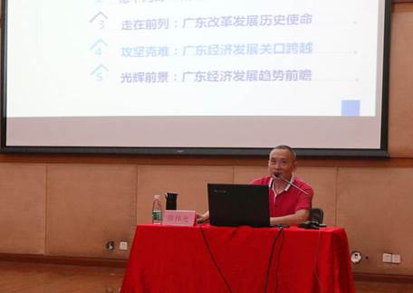 会议上,陈伟光教授做了题为《习近平总书记关于“四个走在全国前列”重要讲话精神解读——当前广东经济形势报告》的思政宣讲会。他以广东改革开放40年来的成就为切入点,对广东的经济形势进行深入的分析。他认为,广东的经济发展已经迈向创新驱动阶段,现阶段经济发展稳中向好。近年来,习近平总书记对广东的工作做出了多次重要指示,为此,广东需要全面深化习近平总书记重要讲话精神的学习贯彻,把“四个走在全国前列”要求落到实处,以新担当新作为开创工作新局面。陈伟光认为,广东经济发展有着光辉的前景,特别是粤港澳大湾区的建设为广东的发展提供了历史机遇。大学在粤港澳大湾区有着四大发展定位,即国际科技创新中心的孵化器、国家关键核心技术的研发地、综合创新创业人才培育基地、新型岭南文化环境塑造园地。他表示,中国正大步迈向世界舞台的中央,广东作为展示改革开放成就的窗口和国际社会观察我国改革开放的窗口,广东省任重道远。