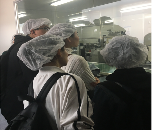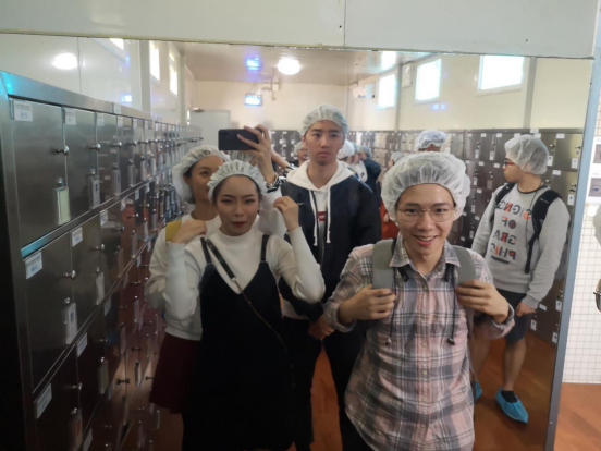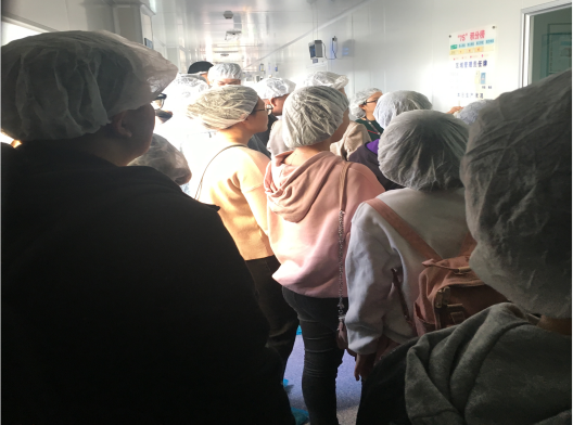 22号下午14点,同学们到达坐落在广州市番禺区化龙镇的花安堂生物科技集团有限公司。在开始参观生产车间之前,花安堂的人力资源部门工作人员先给同学们介绍花安堂的生产基地状况以及生产过程管控流程。花安堂的无尘车间严格遵照ISO22716及GMP(US)体系建立产品研发系统、产品质量保障系统、实施7S目视化管理,并采用全员全过程质量管理(即TQM工作法)。按照既定的流程,同学们先后参观了无尘车间内的包材挑选室、包装车间、检测车间等。
