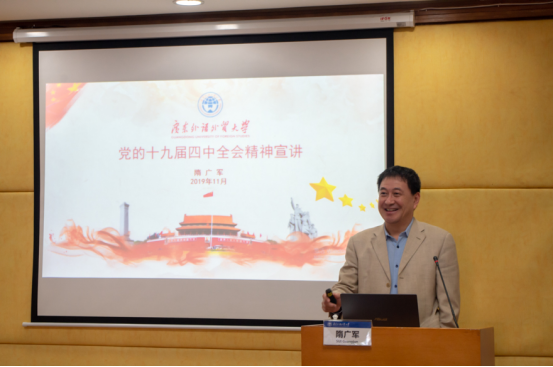 隋广军指出,全体师生要深入贯彻落实党的十九届四中全会精神,坚持以人民为中心这个出发点和落脚点,坚定制度自信,切实把制度优势转化为治理效能。隋广军结合粤港澳大湾区和深圳先行示范区“双区驱动”,鼓励广外师生,要紧抓机遇大有作为。