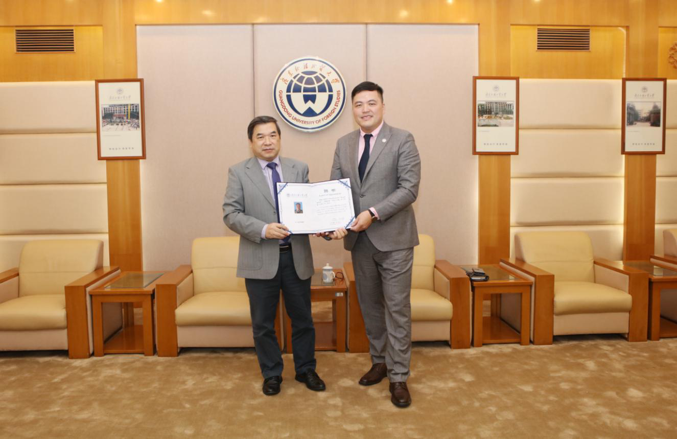 云山讲座教授聘任仪式在北校区行政楼迎宾厅举行,焦方太副董事长代表大学为沈伟颁发聘书。