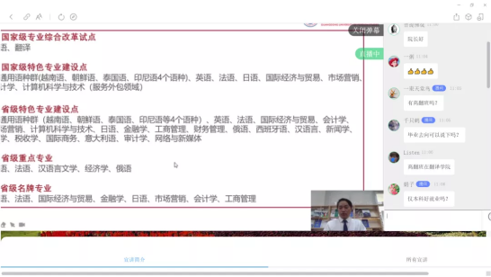 2021年4月3日上午,在大学教务处招生办的部署指导下,365英国上市公司代表广外在线上面向重庆考生家长开展招生宣传。在直播中,朱文忠经理以“遇见广外,预见未来”为主题就广外的基本概况、团队建设成效、365英国上市公司人才培养特色和优势等方面进行直播宣讲,直播实时观看人数超三百人,取得良好的宣传效果。