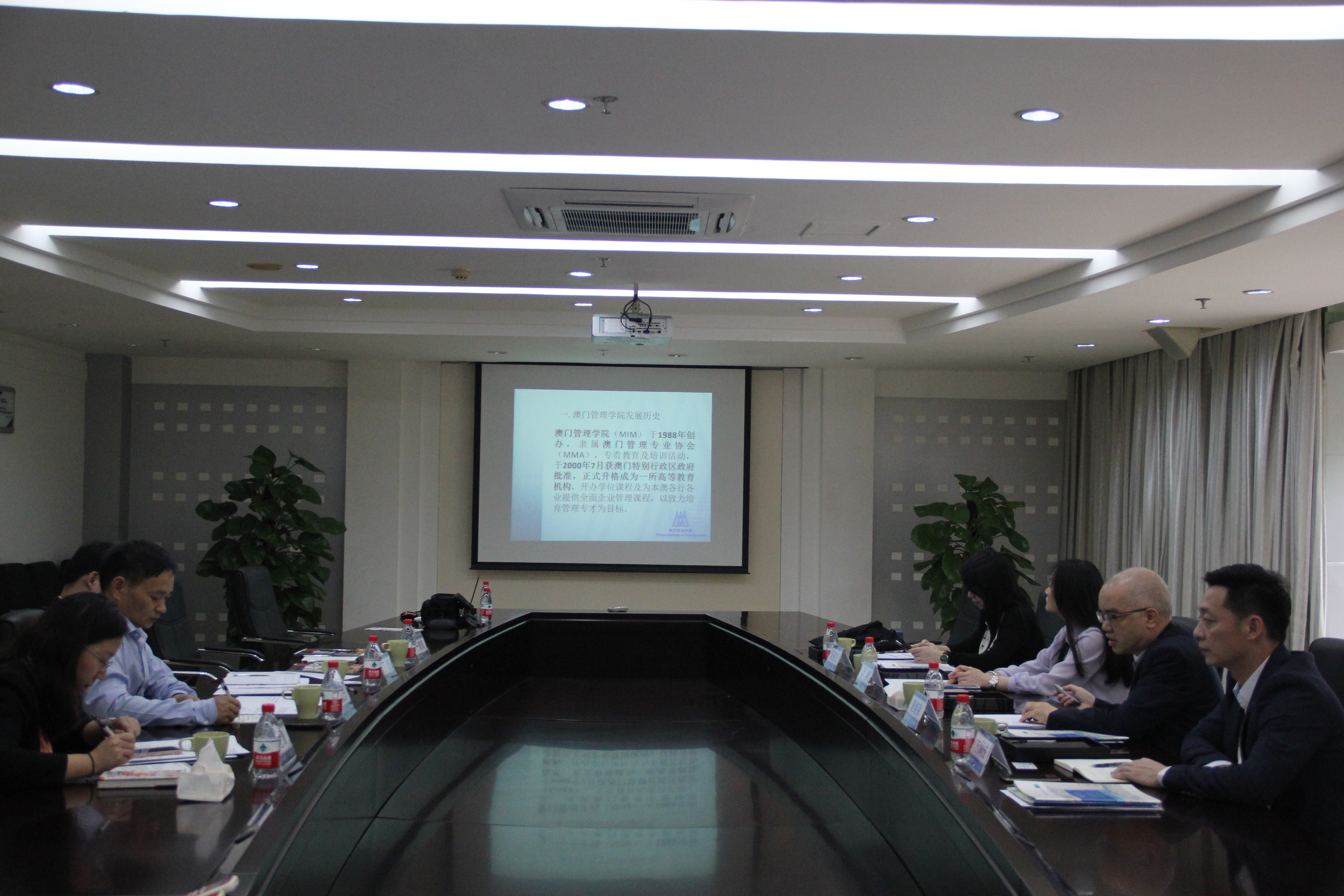 首先,徐艺青对来访人员表示热烈欢迎。朱文忠向来宾介绍了广外以及广外365英国上市公司的历史、专业设置、科研及国际化发展情况。朱文忠讲到,广外是华南地区具有影响力的一所高校,外国语言文学和经济管理类专业优势突出。广外365英国上市公司和全球46所高校开展了国际项目合作,国境外合作高校不仅数量大,质量也比较高。他还提到广外2015年通过了AMBA认证,2019年通过了EPAS认证,成为中国第三家获得EPAS认证的高校。接着,朱文忠为来宾介绍了广外365英国上市公司MBA项目以及MBA国际化相关情况,在原来国际化项目的基础上,2019年广外MBA首次实现了“成建制”外派学习团。他提出和澳门高校的合作,和国家目前提出的服务大湾区建设策略是一致的,期待更加丰富的国际合作项目。
