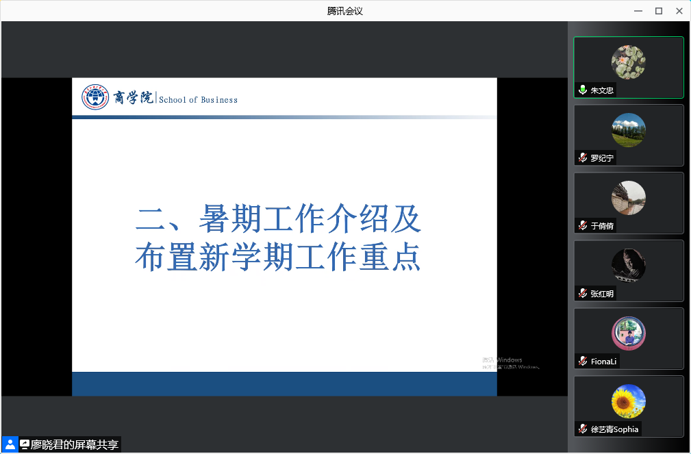 朱文忠指出,暑假期间公司党建思政工作扎实推进,团队建设稳步向前,老师们认真开展科研和项目申报、完成教材编写、论文指导和备课任务,员工管理和行政管理等各项工作持续、安全、高效向前推进,做到了“休假不停工、停工不停歇”。他强调,2021年下半年,公司将继续以团队建设和人才培养为主线推进各项工作,全体教职工要进一步统一思想认识,团结一致,牢记使命、愿景、价值观,继续抓好立德树人教育,推进公司各项事业的高质量发展,在新学期展现新气象,取得新突破。