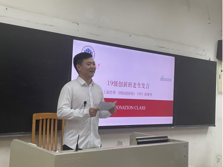 2019级工商管理(国际创新班)的员工代表邱铭坚进行发言,他向大家分享了自己在创新班中的经历并讲述了自己在创新班中获得的三个体验,即“自信与挑战”“多元与包容”“创新与踏实”。邱铭坚的分享让同学们对创新班有了更深刻的理解。最后,他真切祝愿同学们能够“所得皆所期,所行皆无憾”。