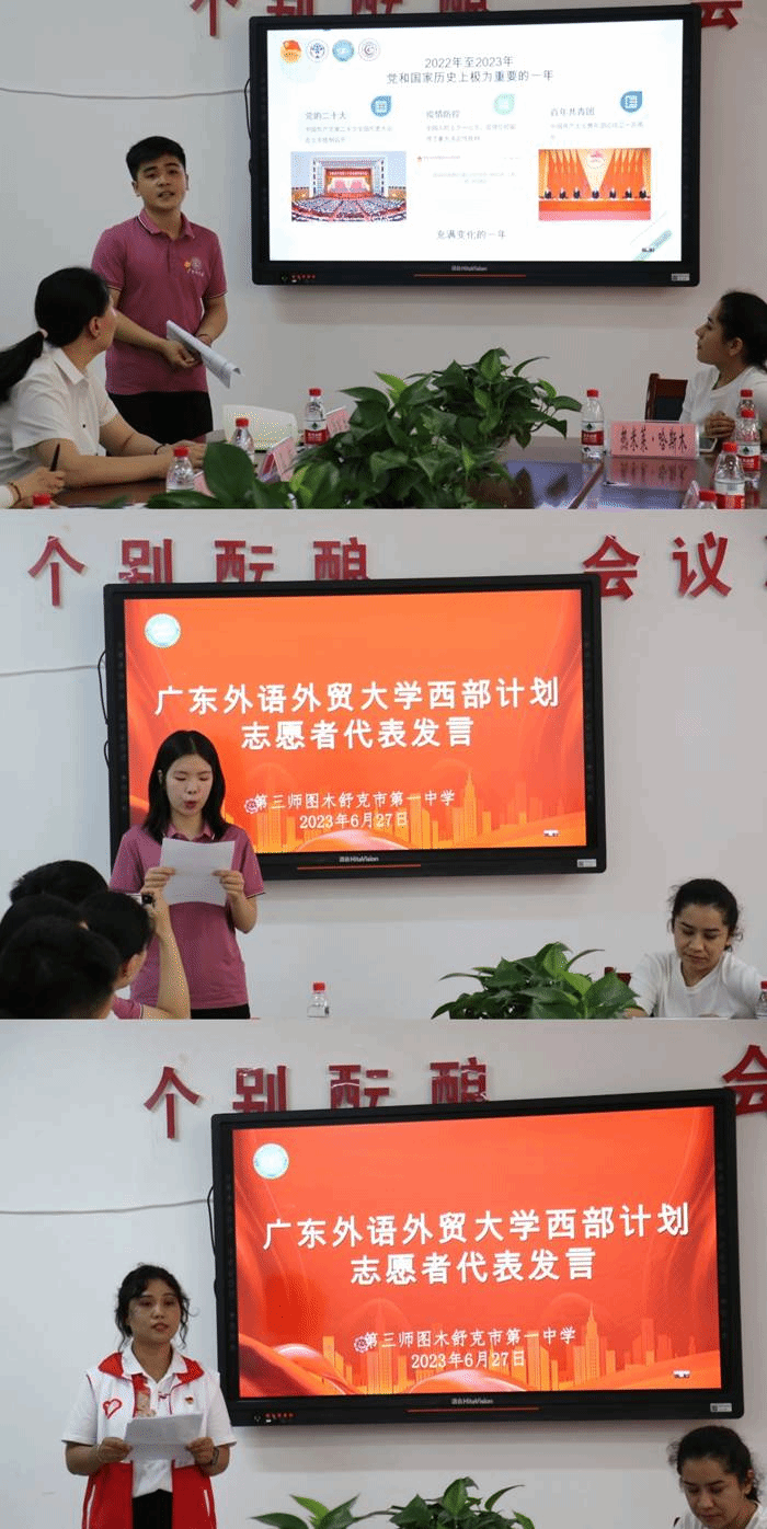 紧接着,唐锐就三师团委、三师一中对志愿者的关心和照顾表示了感谢,并对广外以及广外青燕研支团新疆分队的建设历程进行了介绍。他表示,希望能够加强与新疆的合作,为建设西部输送更多人才,同时也将培养更多具有秉持“明德尚行、学贯中西”的校训,作风扎实、勤恳能干的员工,在支援新疆教育工作中贡献广外力量。