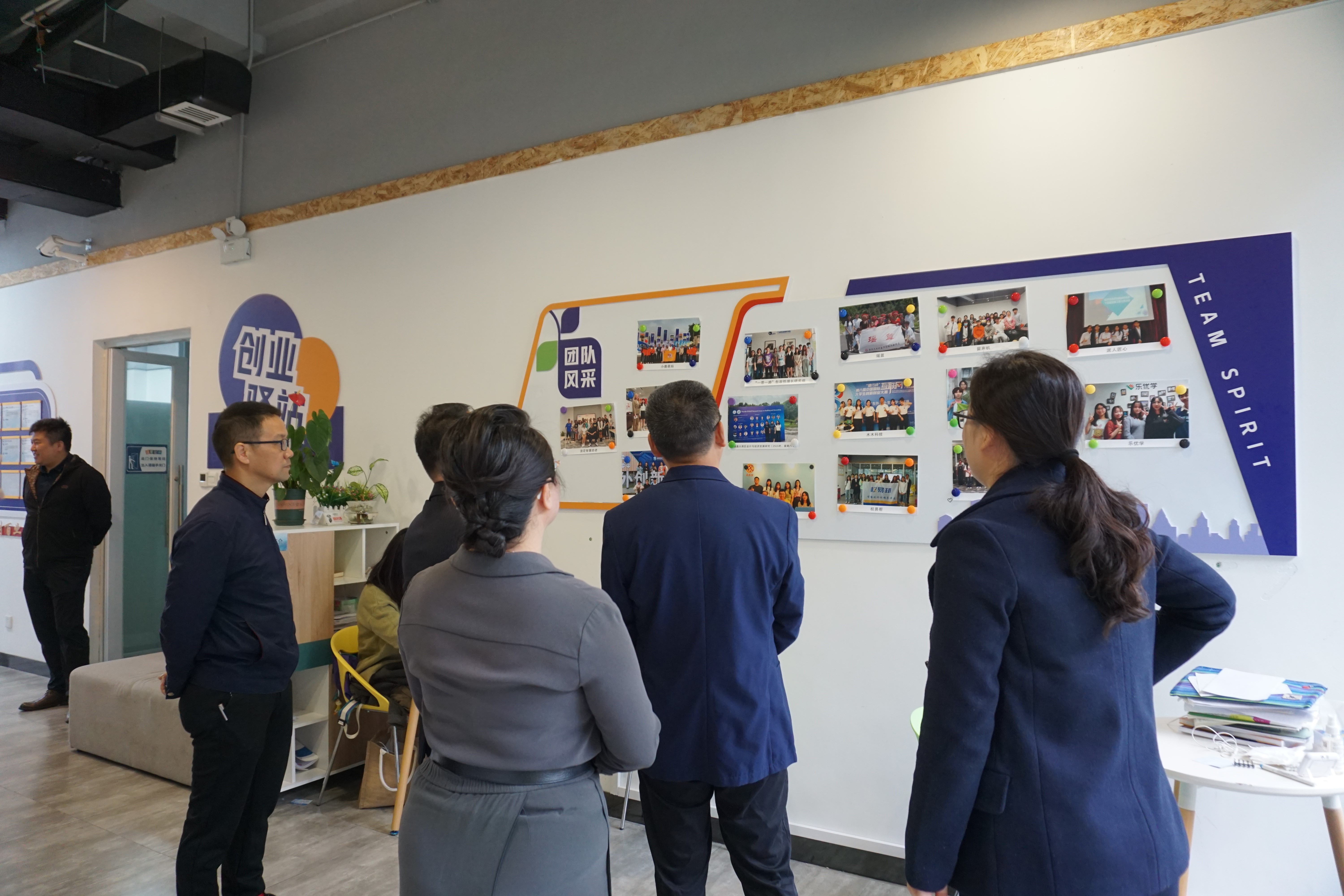 曹婷婷带领调研组一行参观国家级实践基地各功能区域、走访了入驻的员工团队办公室,与员工创业团队“浪花智慧助老”“木木科技”亲切交流,详细了解员工项目的发展,倾听师生民意,对公司学子敢闯敢创、抓住用户痛点需求的精神和能力表示赞赏。