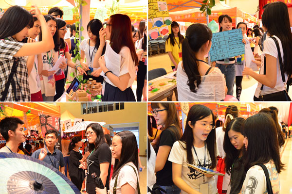 为了吸引更多的客商来到自己的展位,16支队伍纷纷使出“杀手锏”。“湅帛”将展位装饰成一个木亭子,几缕青叶在亭下随风飘动,与朵朵红花相呼应和,再现小清新的自然之感。“嘀嗒”在抓住当下毕业季的热潮和广外50周年校庆契机的同时,结合公司主打的“时间”理念,建起了迷你的广外钟楼和广外校门模型供客商们合影留念。除了摊位布置,独特的产品推销方式也是展商们吸引顾客的重头。“可灵纳”则通过视频材料,以一种更生动、幽默的方式来介绍自己的产品。“颜谛”在摊位中设置了体验区,客商们可以在投资前对产品进行试用,以此增加对产品了解的深度,做出更加明智的投资决定。不少参展商也都结合各自的宣传策略换上了民国服、旗袍、汉服等特色服装,为企业的宣传增色不少。