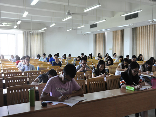 开考前考生陆续进场,监考人员将考试细则宣读完毕后,考生们放好行李按规定安静就坐。