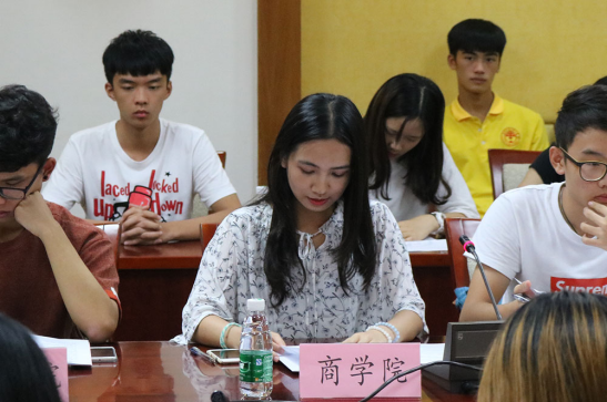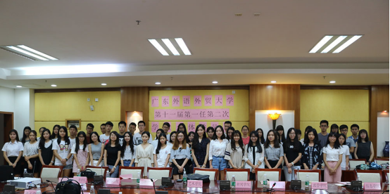 会议进入第一项议程,广外校员工会主席高婧通报近期工作情况。高婧从迎新活动、招新活动、与校后勤处的座谈会、校员工会公众号改版、“挑战杯”准备工作及资料整理等几个方面出发,有条不紊地通报了近期工作情况。