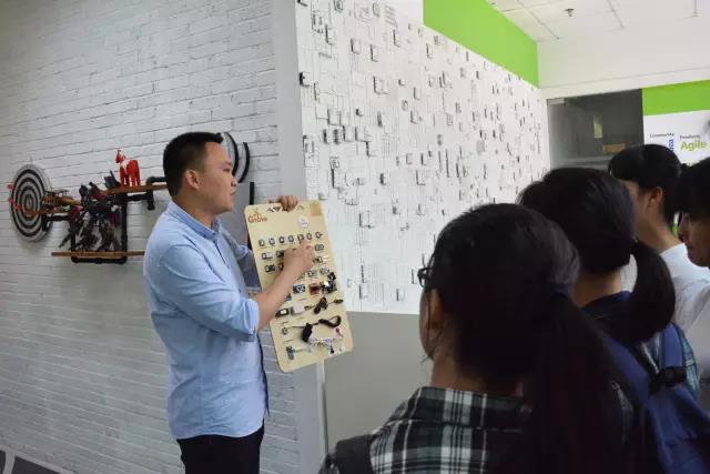 早上9点30分,同学们来到了柴火创客空间所在地——华侨城创意文化园。一进入柴火创客空间的工作地点,同学们便被桌上摆放着的各种新奇小型创客科技产品所吸引。柴火创客空间的负责人告诉我们,这些功能各异的小玩意儿都是创客们根据平日生活中的观察,加入自己的创意制作而成的作品。随后,他又向我们展示了工作室墙上悬挂的一些高级的主控板和传感器。同学们兴致勃勃,看得入神。