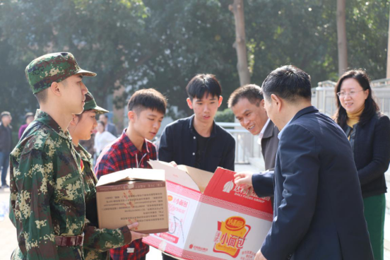 领导一行还给每位教官与新生带去了公司精心准备的慰问品。同学们纷纷表示,非常感谢公司领导的关怀,在接下来的训练中一定不辜负公司领导的殷切希望,以更加饱满的热情投入到训练中,争取在军训汇报演出中取得优异成绩。