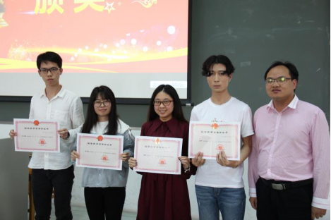 分享会开始,首先是颁发奖状环节,四位获得国奖的师兄师姐上台领奖,由与会嘉宾为他们颁发奖状。