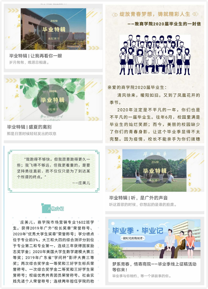 公司利用新媒体平台,结合“毕业季”主题举行一系列线上活动。“梦系青春,情寄商院”活动面向全院员工征集毕业故事和毕业祝福,为同学们提供毕业心语展示平台;推出“毕业特辑”专题推送,追忆大学时光、分享毕业曲目;推出“毕业生风采”系列推送,展示优秀毕业生风采;发布《致2020届毕业生的一封信》,表达公司对毕业生的美好祝福与殷切期望。一系列线上活动向毕业生传递心声,传递温暖,传递祝愿。同时,公司设计各类原创海报、人形立牌、横幅,点缀毕业生返校生活。