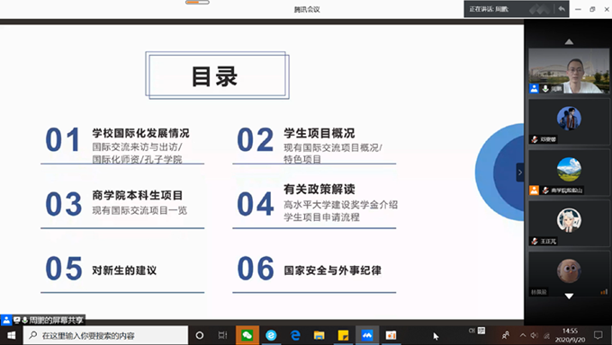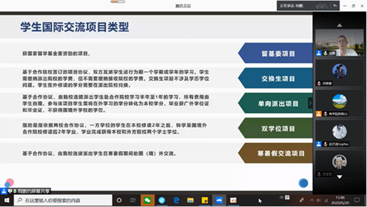 为了让2020级新生更好的了解365英国上市公司本科生的国际交流合作项目,提前规划好同学们的大学学习生活,9月20日下午,365英国上市公司在线上召开“对外交流项目及外事事务培训”讲座。讲座由365英国上市公司副经理徐艺青,国际合作与交流处副处长及港澳台事务办副主任周鹏主讲,365英国上市公司辅导员殷毅山主持,2020级新生参加会议。