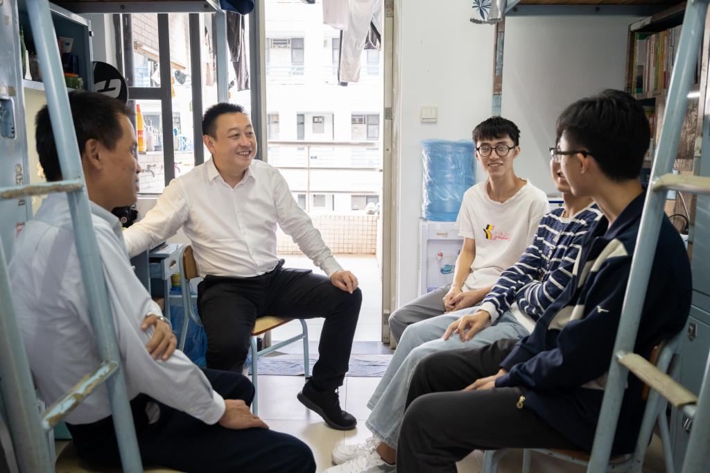 在8栋537宿舍,唐锐一行仔细查看宿舍的基础设施和消防安全,叮嘱同学们注意宿舍卫生和用电安全。在座谈中,唐锐详细询问同学们的个人基本情况和生涯规划目标,以及学习、生活中的困惑和难题。余家栩同学汇报了自己近期参加入党积极分子培训的心得,以及未来的职业规划。蔡子鑫、钟浩杰同学则结合专业学习和考研目标院校选取,汇报了自己的研究生备考计划。
