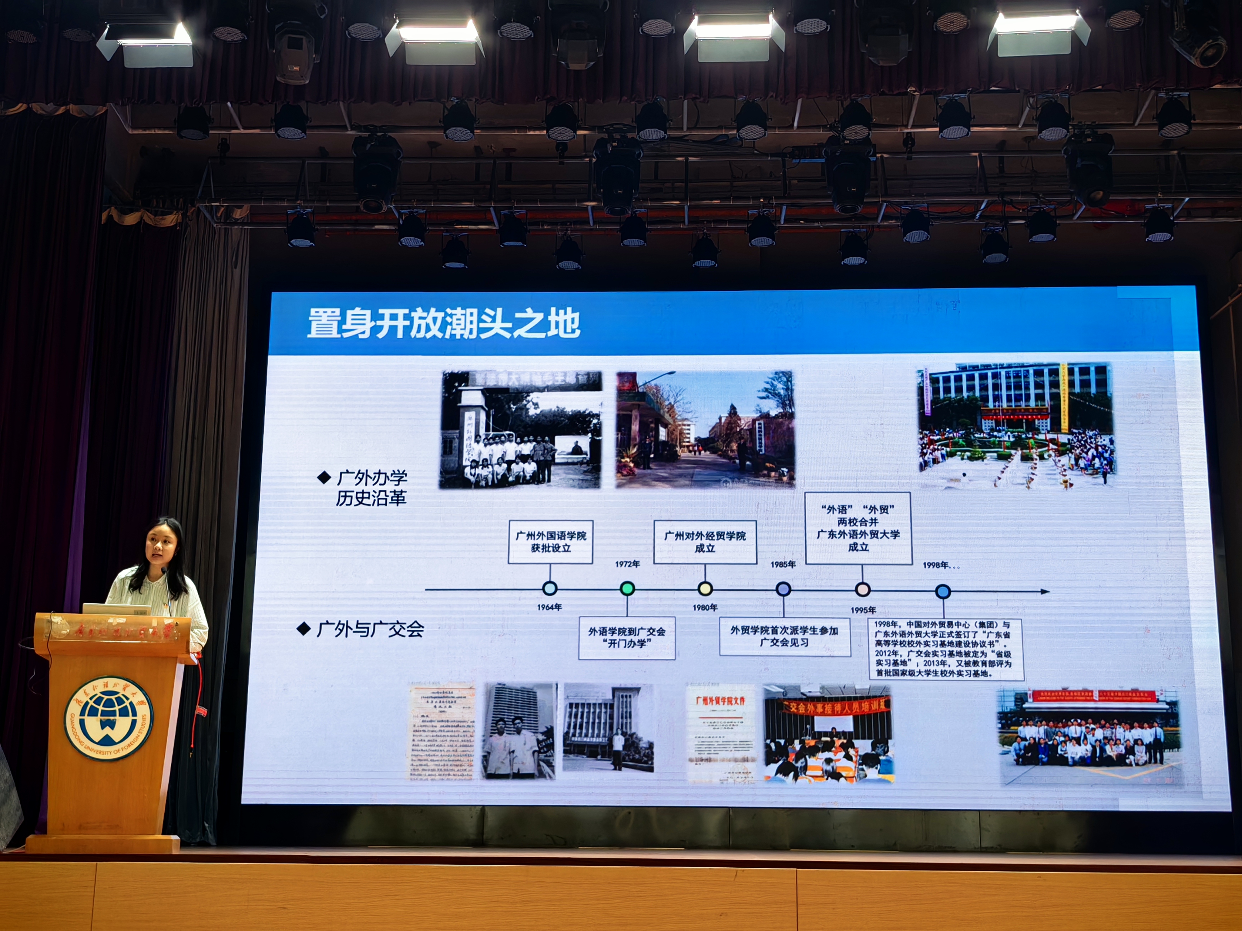 紧接着,罗毅颖以《一起做改革开放的弄潮儿——广交会与广外青年的时代责任》为主题向在座的员工们上了一堂精彩的思政课。她以广交会的发展历程与广外的发展变革为脉络,生动阐述了广交会初创时期的艰辛以及广外学子为中国对外贸易事业所作出的杰出贡献。这不仅让员工们对广交会历史有了更深刻的理解,更加深了他们对广外商科青年所肩负的使命与责任的认同。