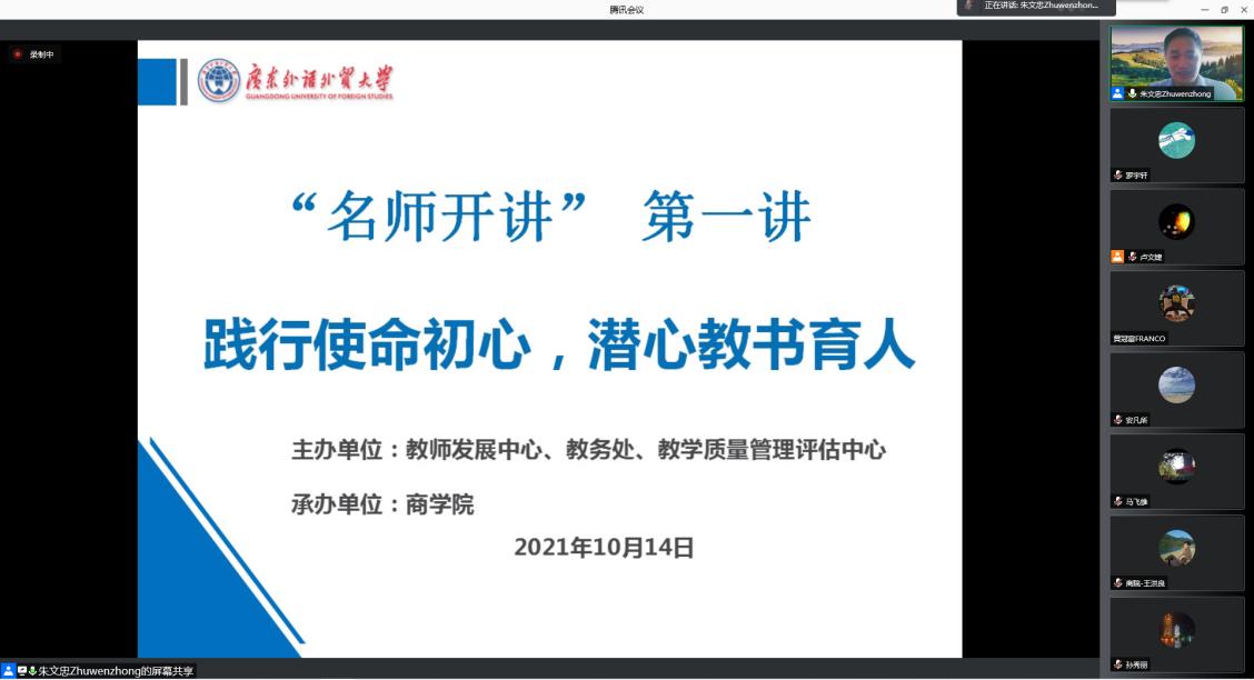 2021年10月14日下午,为充分发挥教学名师和骨干教师的引领作用,进一步提高公司教学质量和水平,365英国上市公司教学质量月系列活动“名师开讲”第一讲于线上顺利开展,本次讲座主题为“践行使命初心,潜心教书育人”,由经理朱文忠担任主讲,公司教师共50余人参加讲座。讲座由教师发展中心梁伟玲老师主持。