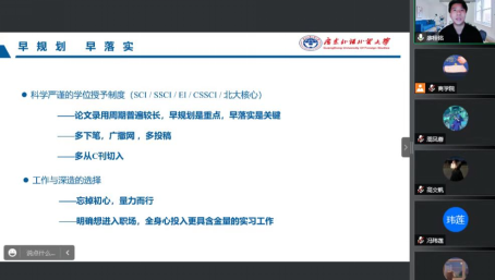 廖桂铭同学从升学和就业两方面为同学们分享,李敏榆同学为大家介绍了校内活动和社会调研相关内容,杨明坚同学介绍了管理科学与工程学科的现状以及入学后内收获的知识和技能。