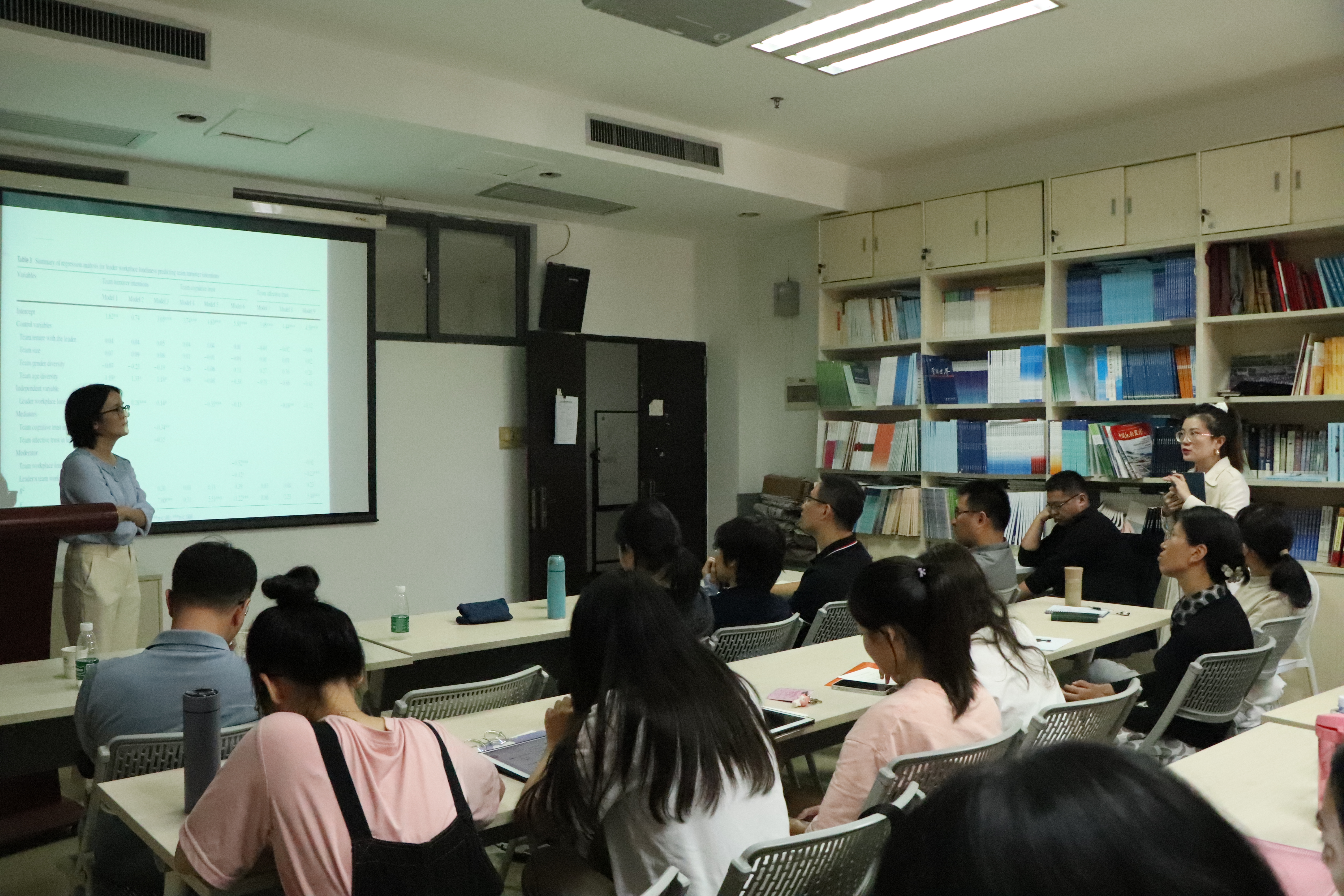 不仅如此,陈晓老师还考察了团队孤独感的调节作用。当领导和团队都处于较高水平的孤独时,领导孤独感的消极效应就较为突出,反之当团队的协调能力很强,领导孤独感的消极作用并不明显。该研究首次将社会资本理论引入领导行为领域,并首次从团队层面研究“孤独感”这一话题,老师同学们对此都很感兴趣,纷纷提出了自己的看法与陈晓老师一同交流。