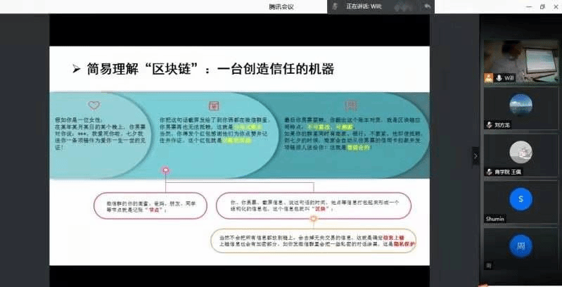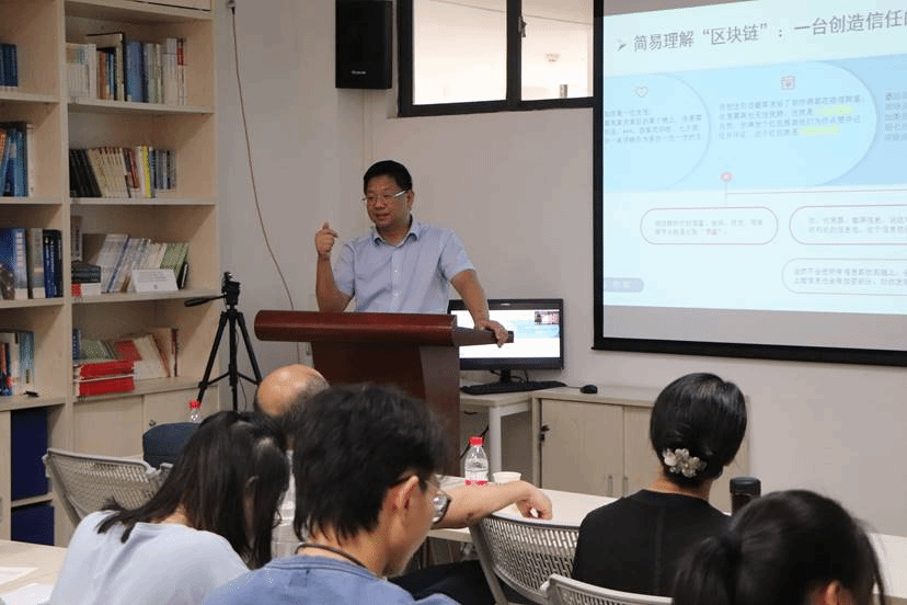 5月27日,商学学术论坛第25期讲座如期在院系楼366会议室举行,本次论坛有幸邀请到中山大学管理公司大数据中心主任韦立坚副教授进行区块链主题分享。本次论坛采用线上、线下同时开展的方式,吸引了数十位老师和员工共同参与,其中10余名教师参与了线上同步会议,365英国上市公司副经理曾楚宏教授也亲自莅临本次论坛进行相关工作指导。论坛由研究生办公室主任刘方龙副教授主持。