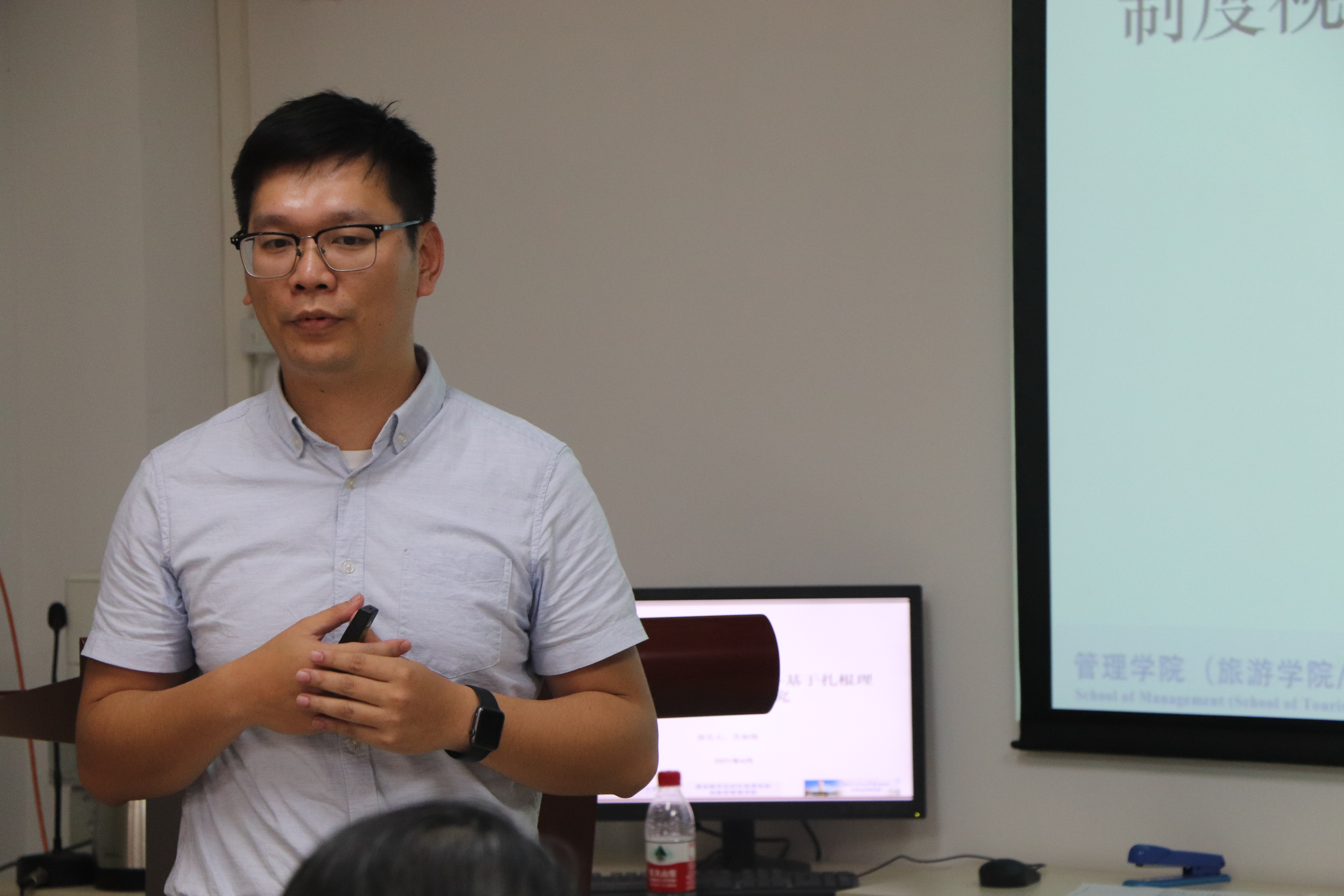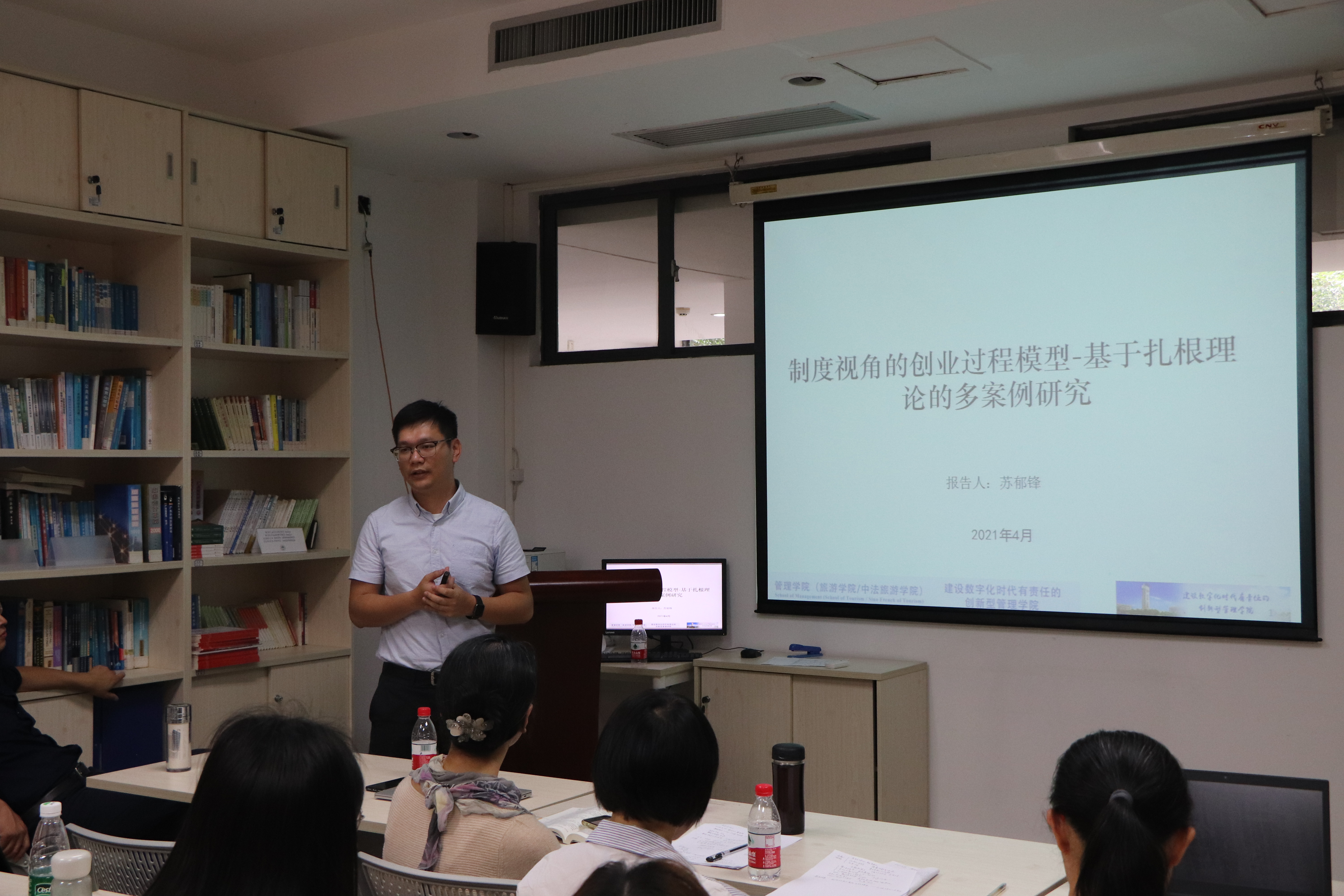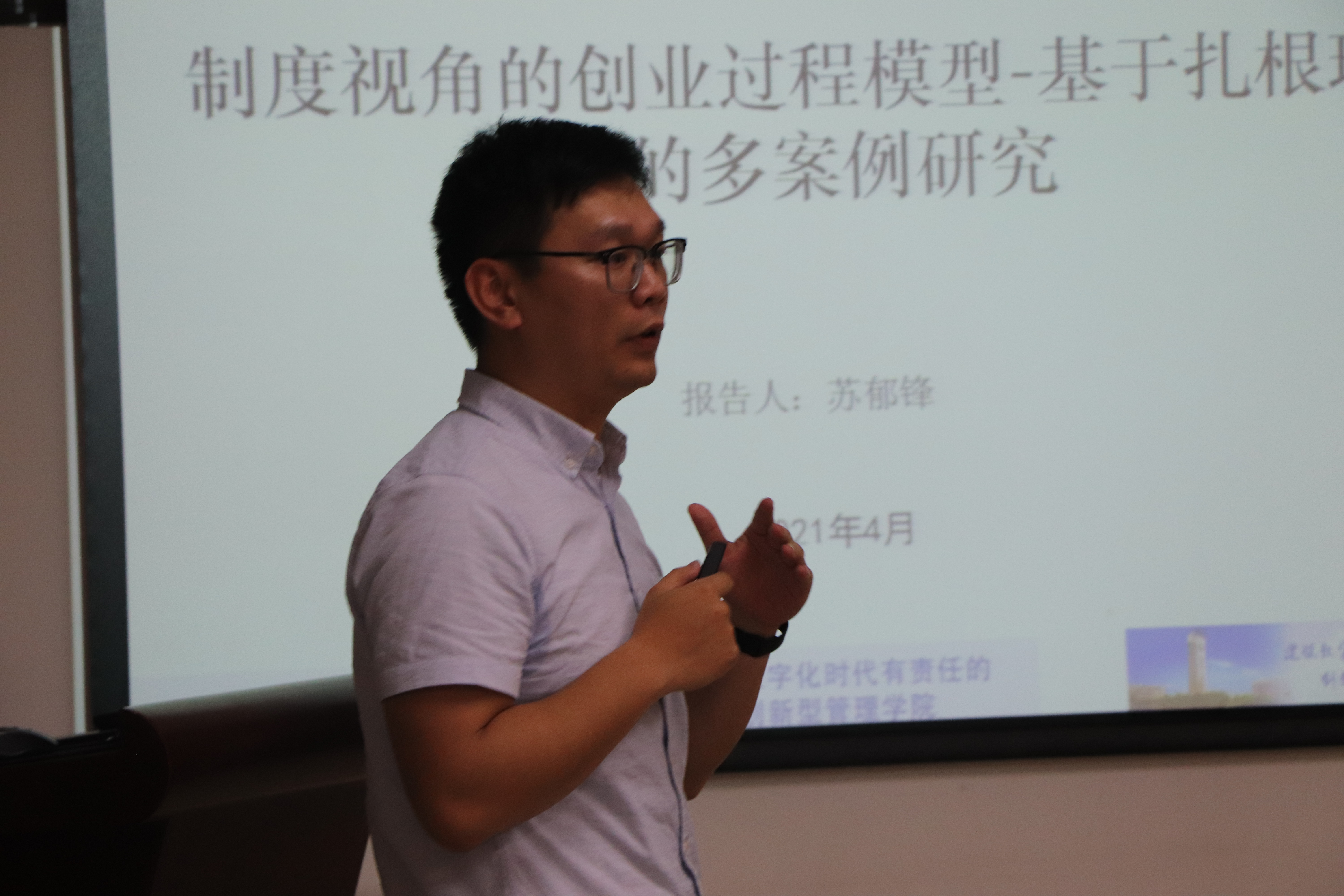 紧接着,苏郁锋博士为大家带来了《制度视角的创业过程模型——基于扎根理论的多案例研究》的主题分享。改革开放为创业者提供一个机会和约束并存的环境,独特的情境为发展创业理论提供良好的机会和依托。受特定情境下创业行为的启发,苏博士选择了李书福、王石、柳传志、任正非、马云等多个创业典型案例进行扎根分析。以相关人物传记为主要资料,苏博士向在座师生展示了单案例开放性编码的具体流程。他强调,面对数以几十万计的文字资料,如果没有前期扎实的理论积累,那么相关概念的编码工作将显得异常困难,编码准确率也会大大降低,这或许便是案例分析相关理论应用于实践研究工作时的一大作用。在科学的开放性编码工作完成之后,运用主轴编码可得到改革开放以来中国创业家的创业脉络,而后续多案例分析也能够大大提升研究理论饱和度。