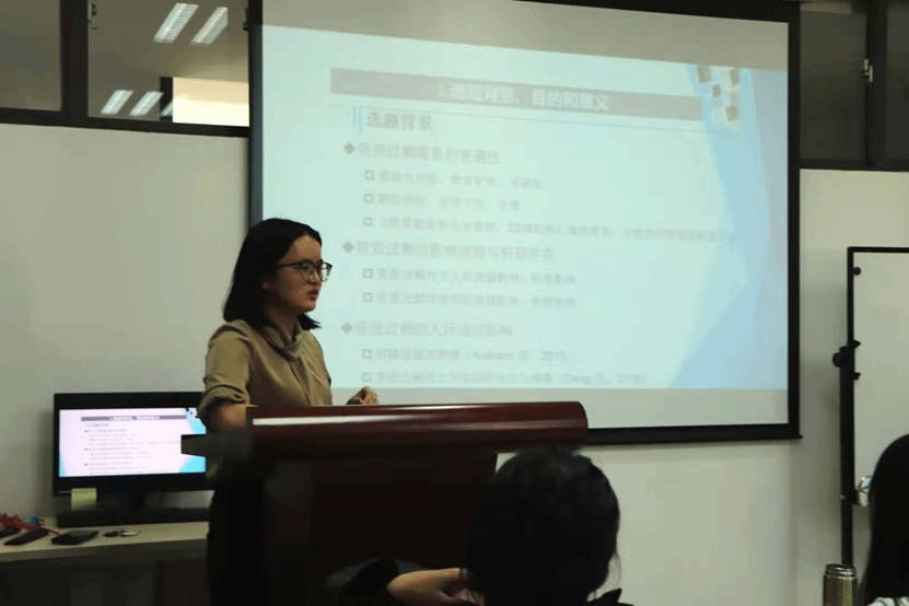 随后,陈晓博士进行了“资质过剩感现象研究进展与介绍:一些已有的实证研究与理论模型构想”的主题演讲。随着经济下行以及教育扩张的宏观环境影响,资质过剩现象在我国越发普遍,因此,传统通过避免招聘资质过剩员工来预防其消极影响已难以奏效,应寻找资质过剩员工过剩人力资本利用的新途径,才能解决资质过剩现象引发的一系列管理问题。陈晓博士重点研究具有资质过剩感的员工如何通过不同的印象管理手段以达到不同的人际相处效果。同时陈晓博士还关注这些具有资质过剩感的员工对领导的自我推销到底是会引起领导排斥还是领导喜爱。研究表明,只有员工采取厚积薄发的方式,通过实干提升自己的组织地位,此时资质过剩下的自我推销才更容易被领导接受和认可。陈晓博士在最后还提出了未来研究展望,希望在未来探索出将员工过剩的人力资本转化为组织社会资本的新路径,在座老师也对陈晓博士的展望表示高度赞同和肯定。
