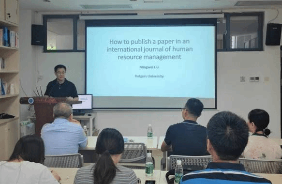 2023年6月20日,美国罗格斯大学管理与劳动关系公司副经理、全球工作与雇佣中心主任刘明巍教授应邀为公司师生开展主题为“How to publish a paper in an international journal of human resource management”的学术讲座。本次活动由公司谢俊教授主持。谢俊首先代表公司师生对刘明巍教授的到来表示欢迎,并简要介绍了刘教授的履历及学术成就。